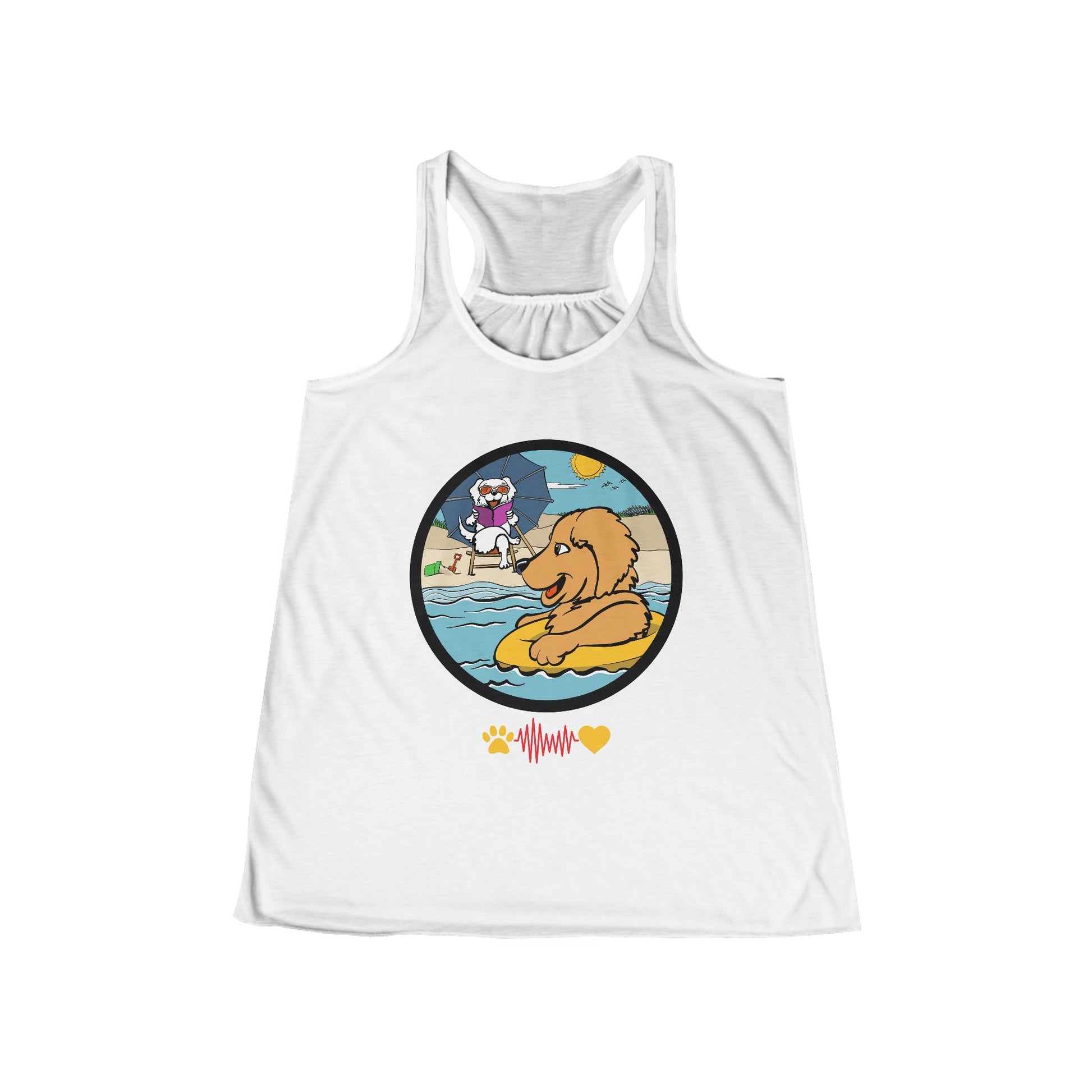 For the dogs who read, float, and fully commit to the art of doing nothing — this racerback celebrates Vacay Mode, where rescue life meets beach life in the most unapologetically relaxed way. One pup lounges under an umbrella with a good book and better sunglasses, while the other drifts by on a raft, golden and grinning.